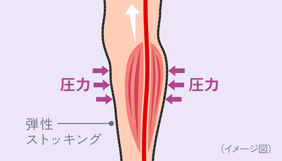 弾性ソックス(一般医療機器)は、着用中に外側から適度な圧力を加えることで、リンパ液や血液が心臓に向かって流れるのをサポートします。